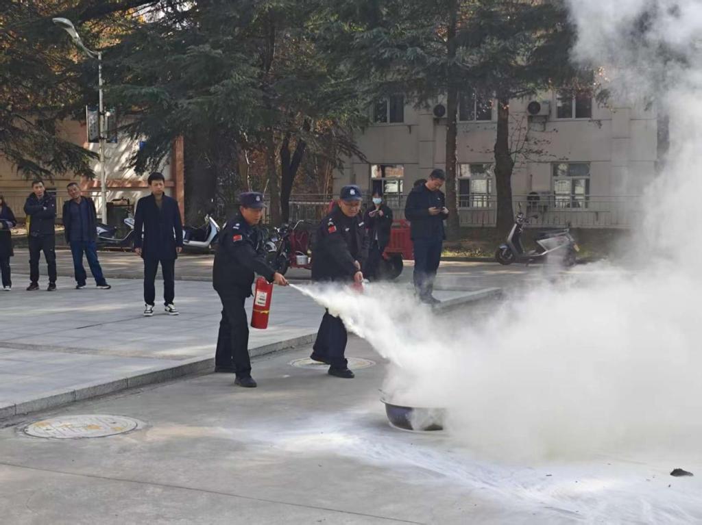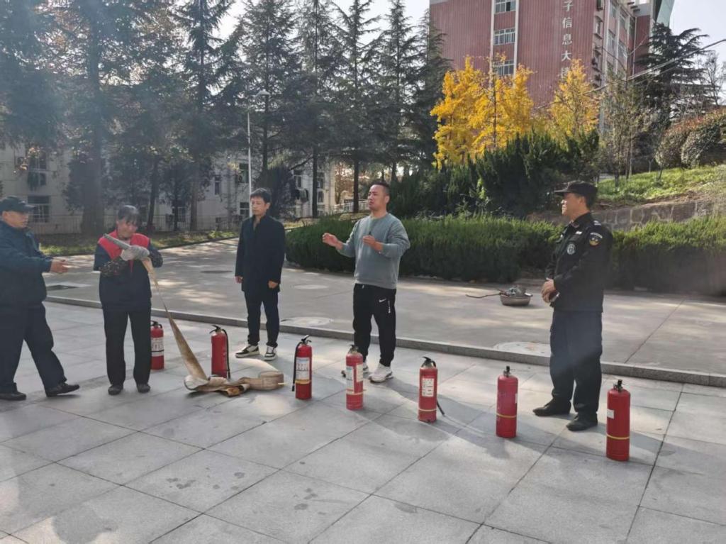 理论知识培训结束后,紧张有序的灭火实战演练随即展开。在演练现场,保卫处工作人员预先设置了模拟火点,并详细讲解和演示了干粉灭火器“提、拔、握、压”的操作要领以及消防水带的连接和使用方法。