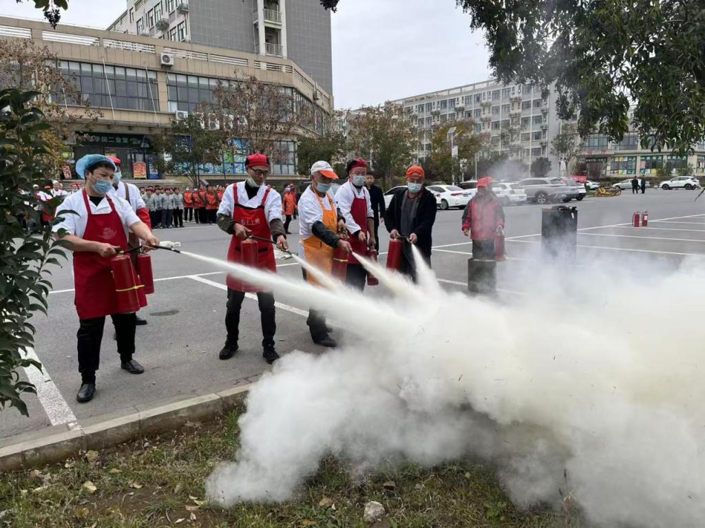 在工作人员的专业指导下,参训人员分组上阵,轮流操作。从食堂厨师、保洁阿姨到保安队员,大家纷纷拿起灭火器,对准熊熊火焰进行扑救。整个过程组织严密、井然有序,参训人员动作规范、反应迅速,成功扑灭了所有“火情”,达到了预期效果。